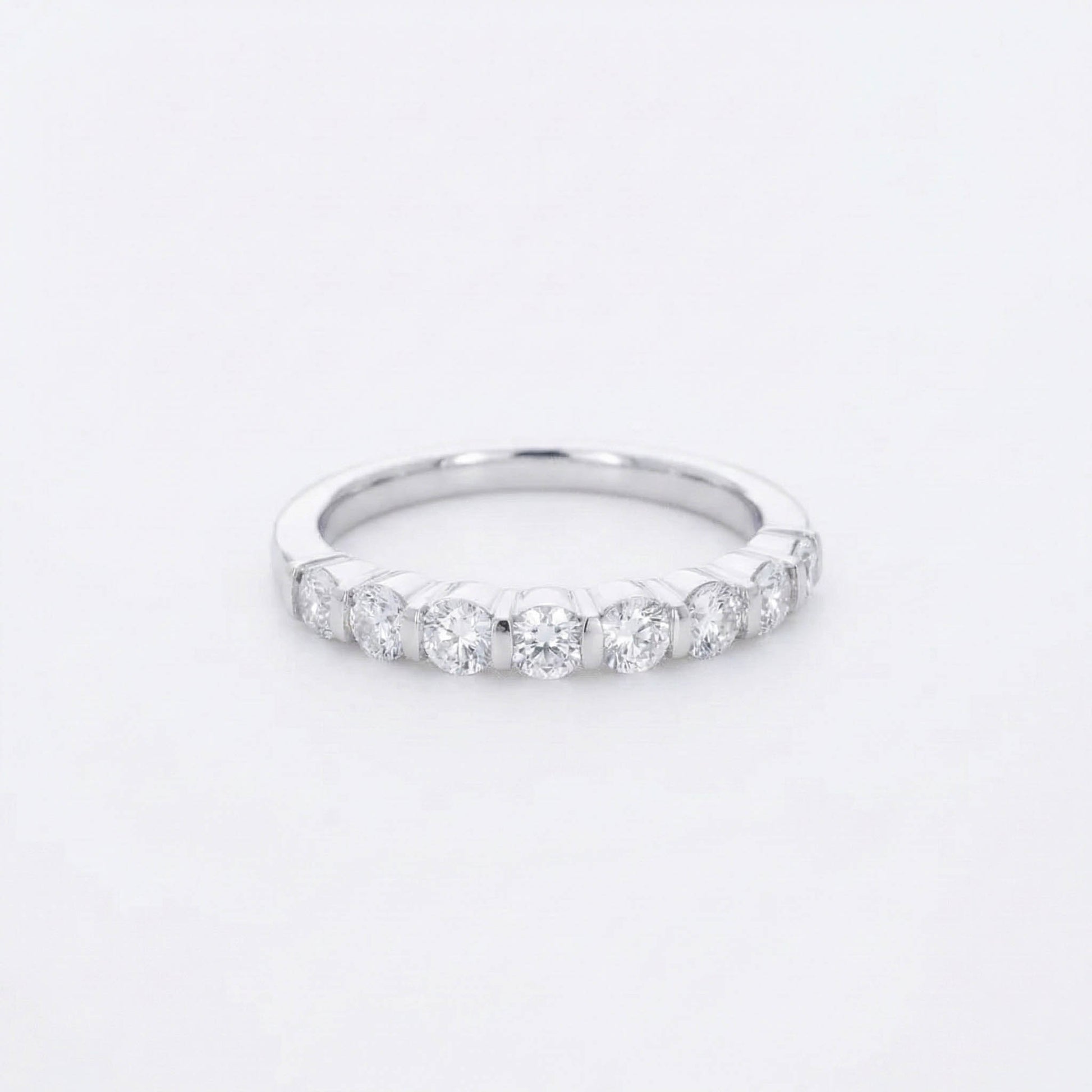 The diamonds are securely set in a bar-prong setting, allowing maximum light to pass through each stone. This innovative setting style enhances the brilliance and fire of the diamonds, creating a radiant display of sparkle. The sleek and sophisticated design of the band makes it versatile enough to be worn on any occasion.