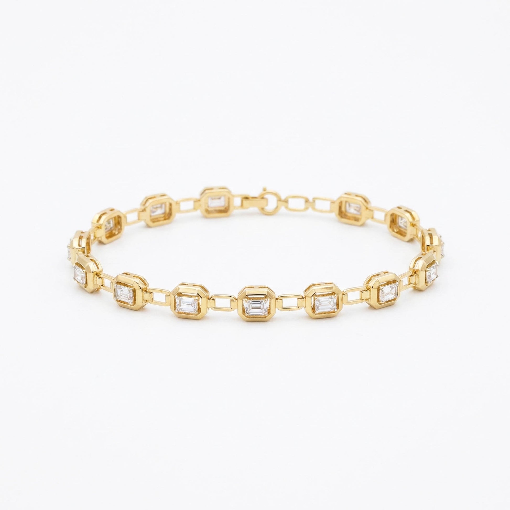 The bracelet showcases breathtaking emerald-shaped LGD solitaires, known for their clean lines and striking facets. Each diamond is nestled in a unique textured design, which is designed to add depth and character to the piece. Our lab-grown diamonds offer an ethical and eco-friendly alternative without compromising on quality or beauty.