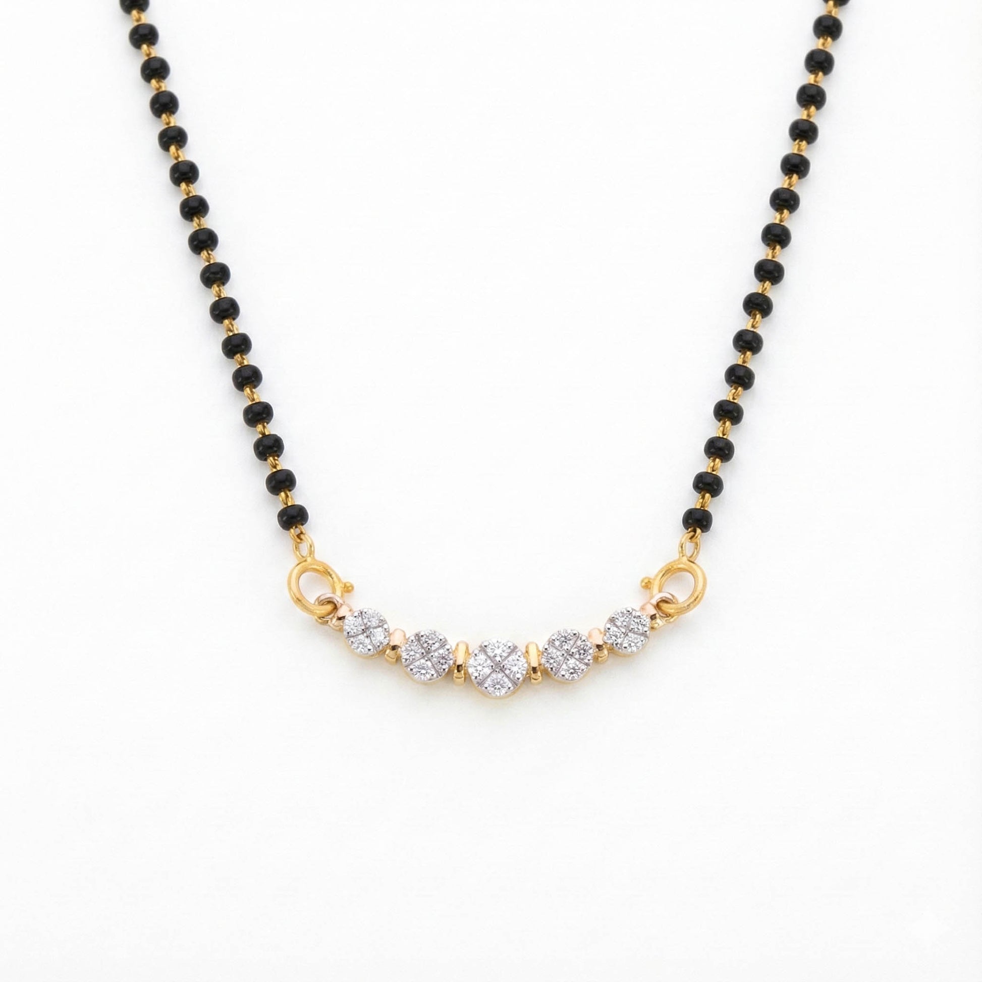 This Joana Diamond Mangalsutra showcases a modern yet timeless design with five glittering diamond clusters as its focal point.
