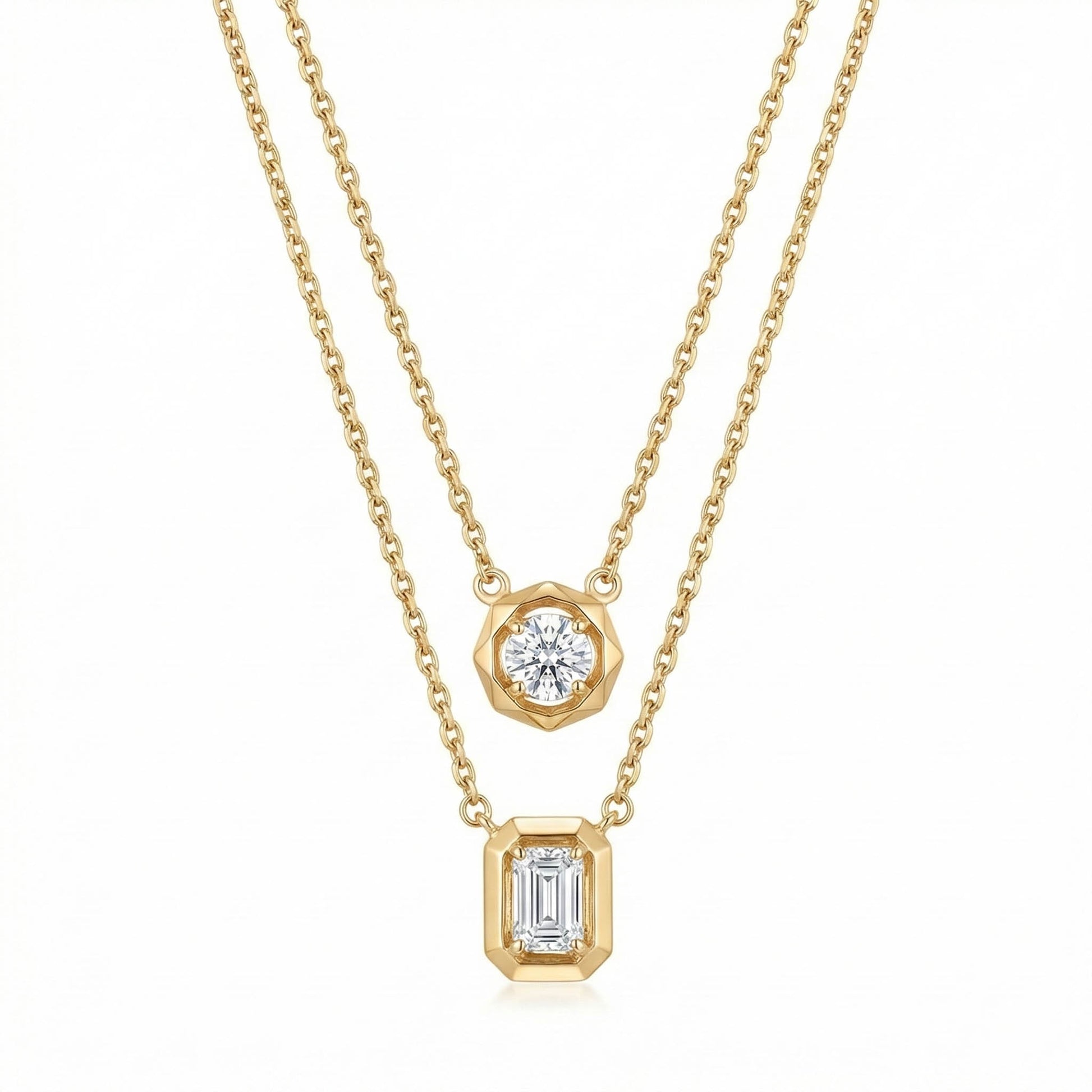 This stunning neckpiece features a harmonious blend of round and princess-shaped lab-grown diamond (LGD) solitaires, each exquisitely set in textured design that add a unique touch of sophistication. This layered necklace is designed to complement any outfit, from a chic evening dress to a casual day ensemble.