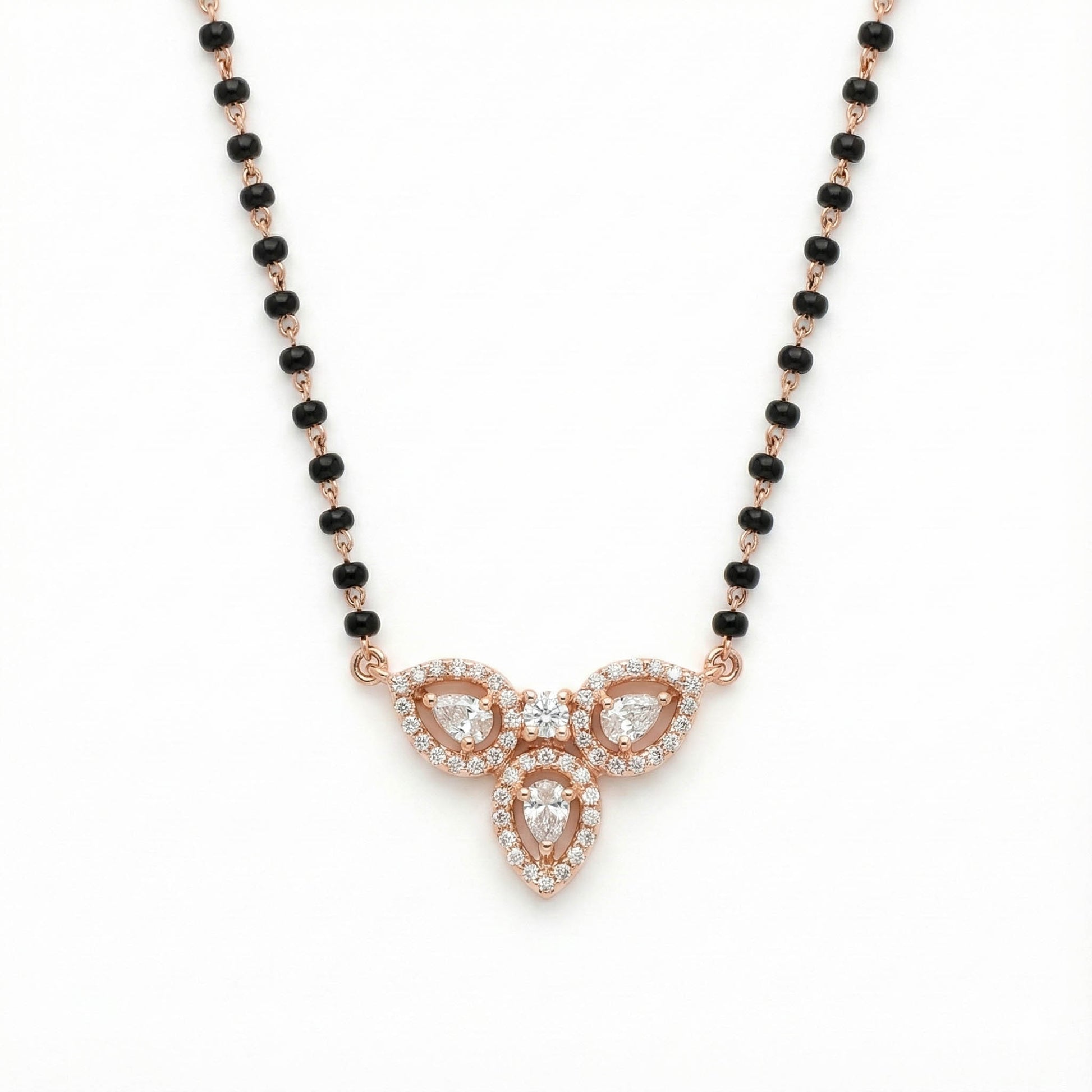 It features a delicate chain adorned with alternating black beads, symbolizing cultural significance. The centerpiece is a stunning tri-leaf diamond pendant, with each leaf-shaped segment set with sparkling diamonds that radiate brilliance. Crafted in a rose-gold finish, this piece is lightweight yet luxurious, making it suitable for daily wear or special occasions.
