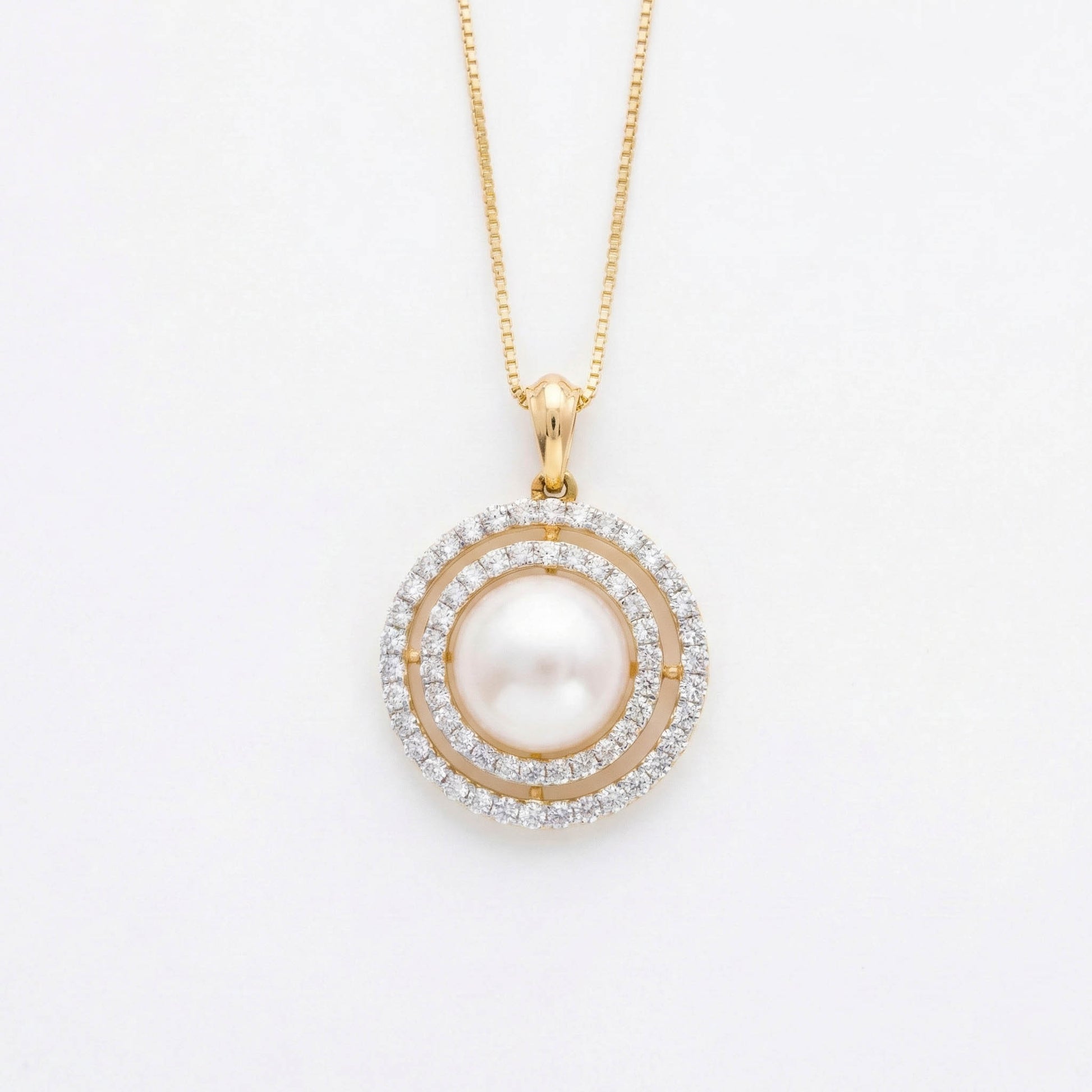 At the heart of this enchanting piece lies a lustrous, perfectly round pearl, celebrated for its timeless beauty and natural radiance. Surrounding the pearl is a brilliant halo of sparkling, ethically sourced diamonds, meticulously set to enhance the pearl's luster.